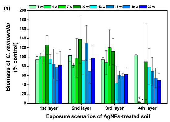 The difference in the toxicity of the contamination configuration-dependent AgNP-treated soils can be attributed to the distance between the stressor (the soil layer) and the receptor (the C. reinhardtii grown on the disc that adhered to the topsoil). The initial effect on the C. reinhardtii grown on the fourth soil layer-treated group was faster than the other exposure scenarios, and third, second, and first soil layer-treated groups showed initial significant effects in that order. The toxic effects of AgNPs are known to be induced by the reactive surface area of nanoparticles (NPs) or silver ions dissolved from them [17,25,26]. In this study, the initial significant effect on the C. reinhardtii grown on the fourth soil layer-treated group may be related to how C. reinhardtii adhered to nanoparticles in the topsoil. Benoit et al. [27] reported strong sorption of Ag on soil ligands in the first few hours. The significant effect of AgNPs over time on the C. reinhardtii grown on the fourth, third, second, and first soil layer-treated groups may be related to the leaching of silver ions dissolved from the NPs. Previous studies also reported on the fate or toxicity of silver ions dissolved in soil from NPs over time [27,28,29]. Arenas et al. [28] reported that 25 and 75 nm PVP-AgNPs have low retention and high mobility in tropical soils. Diez-Ortiz et al. [29] reported that silver ions dissolved from NPs in 50 nm untreated AgNPs increased the toxicity of the latter for earthworms over time. Benoit et al. [27] reported that silver ions released from AgNPs at the end of their experiment were ten times higher than those at the beginning of the experiment.