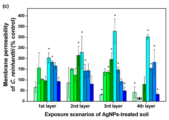 Physiological effects of Chlamydomonas reinhardtii dependent on the time and contamination configuration in soil treated with silver nanoparticles (AgNPs). (a) esterase activity, (b) oxidative stress, and (c) membrane permeability. Asterisks (*) represent results that are significantly different from the control (p < 0.05). N stands for “not applicable” due to low cell density.