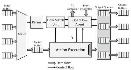 Figure 1 describes the basic system architecture of an SDN switch proposed in [1]. Arriving packets are temporarily queued at the input buffers and are then removed by the Arbiter and placed scheduled into the Packet Buffer. A copy of the packet header is forwarded to the Parser. The Parser parses the packet header to extract the header fields and then creates a tuple with the extracted information and forwards it to the Flow Match Unit. In the Flow Match Unit, the tuple is matched against existing flow rules stored in Flow Tables’ flow entries. The flow entries in the Flow Tables are maintained under the controller’s guidance and are updated when the controller installs new flow rules. The Flow Match Unit determines whether the packet is associated with a known flow and hence a known path. In case of success, the packet is then forwarded via the backplane. In case of failure (no flow table entry matches the packet header), a packet-in message will be sent by the SDN switch to the corresponding SDN controller [60] to notify the controller about the absence of a flow rule for the packet. The packet-in message contains either the packet or the packet’s ID. The controller decides the correct action for the packet and then installs appropriate data in the flow table of the switch so that packets belonging to that particular flow can be forwarded subsequently. If there is no corresponding response from the controller, the packet will be dropped.