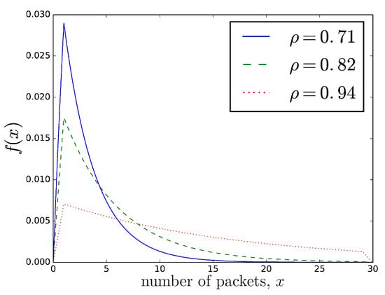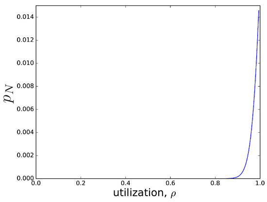 In this way, , given by Equations (2) and (4), approximates the steady-state distribution in the Packet Buffer queue. A few examples of the curve depending on —i.e., the utilization of the system—are presented in Figure 2. The next figure presents , which is the loss probability due to the buffer overflow.