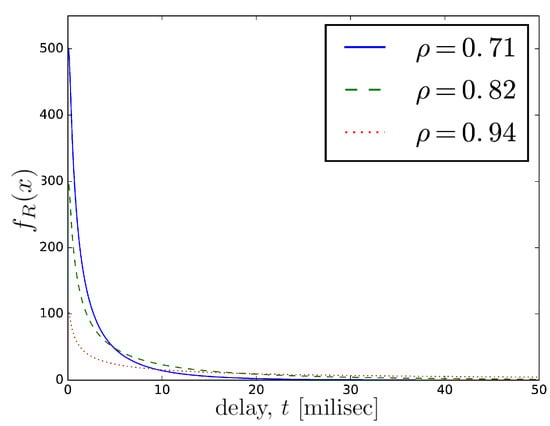 The steady-state queueing delay can be modelled by the time it takes the diffusion process to drift from the point , corresponding to the queue length at the moment of the packet arrival, to when the packet is already on the head of the queue (its distance to the transmitter is equal to zero), and is removed to be forwarded. The density of the diffusion process given by Equation (2) determines the queue distribution and, at the same time, the density of the initial point at Equation (8).