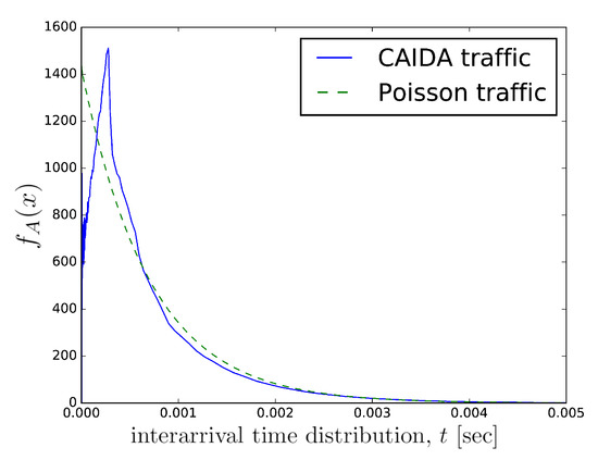 Packet interarrival times of IP traffic and CAIDAmeasurements versus Poisson distribution.