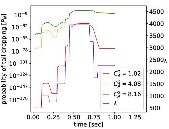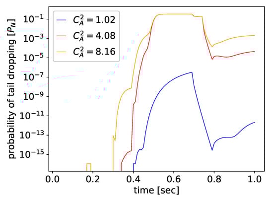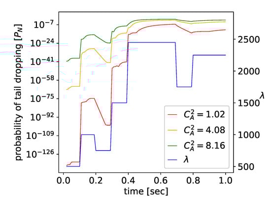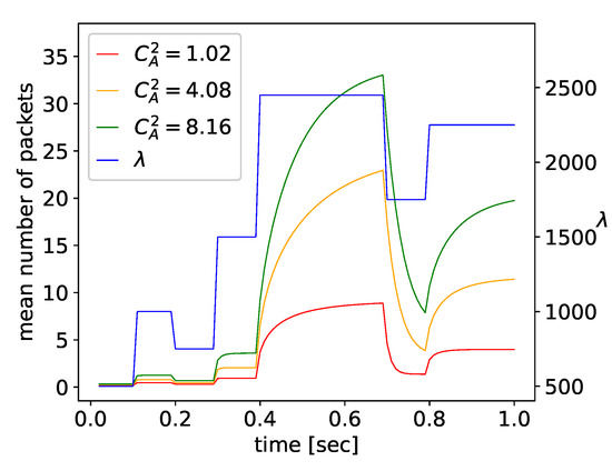 Figure 6 shows the changes in —i.e., probability of packet loss due to the buffer congestion—following the input traffic pattern, and also as a function of the variability of interarrival times, defined by the squared coefficient of variation . Again, even very small numerical values are given by the model, and the computations are stable. Figure 7 presents the time-dependent mean queue. When traffic intensity is small, transient periods are short, and the changes in the mean queue follow the changes of closely. However, for greater values of , i.e., for higher utilization , the transient states are visibly longer than the time between the traffic changes, and the queue is permanently in a transient state. The increase in also increases the duration of transient states and the size of the queue.