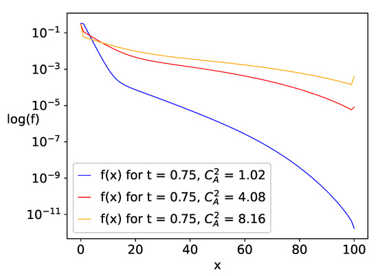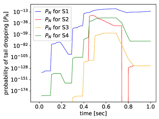 The changes in the input rate during the considered interval of 1 s are plotted in Figure 6 and Figure 7. Figure 8 displays an example of the probability density function in Equation (14) for a chosen moment s. when the empty queue is empty at the beginning of the interval under consideration, i.e., at ; it shows the impact of the interarrival time variability on the density function. It is worth to note the logarithmic scale of the plot and the possibility to determine by the model very small numerical values of the function.