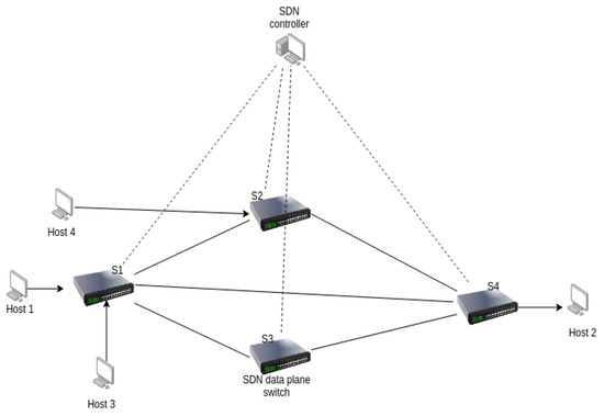 Software defined networking (SDN) is a dynamic, adaptable, and manageable paradigm that facilitates innovations in computer networks [1], together with the prototyping and deployment of flexible routing mechanisms [2,3]. Traditional networking is based on manual configurations of distributed proprietary network devices, a cumbersome and error-prone process that can underutilize network resources [4]. SDN offers a programmable architecture where routing decisions are moved to centralized controllers. SDN data plane switches are simple forwarding devices that forward the data traffic depending on the controller’s flow forwarding rules. Routing algorithms are implemented and communicated by each SDN controller to the SDN switches, which follow its instructions. Metrics such as hub count, delay, packet loss, bandwidth, jitter, and power consumption can be measured by SDN switches and sent to the controllers, which may use these metrics to determine the best routing paths and then install the flow forwarding rules in the data plane SDN switches. Indeed, the IoT [5] interacting Cloud Services [6] for the decision and control of the cyber-physical world create challenges for networks that achieve a better quality of service (QoS) and security and less energy consumption, and can exploit the opportunities offered by machine learning [7,8,9]. These challenges can be met by SDN networks [9,10], which offer greater flexibility and ease of implementation [2,11].