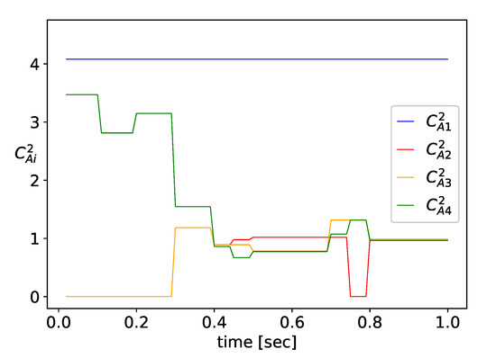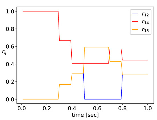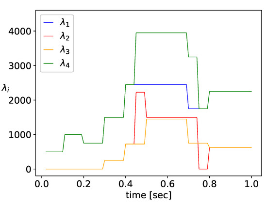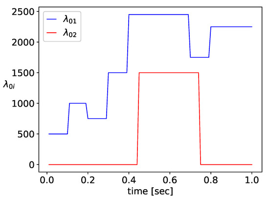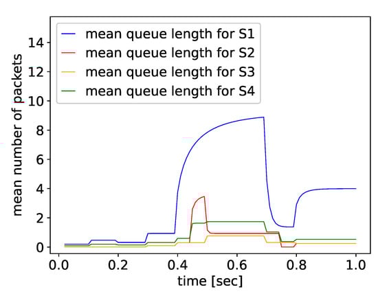 Similarly to Example 1, the network’s performance is investigated during 1 s. Host 1 is sending packet flows of intensity to Host 2, and the traffic rate is changing in the range 500–2500 packets/sec, as shown in Figure 10. Host 4 generates traffic at rate , as shown in Figure 10, which is forwarded to Host 2 via the SDN switches and .