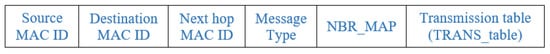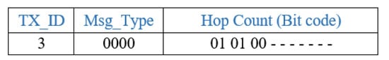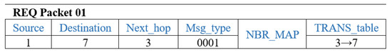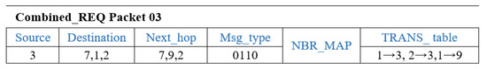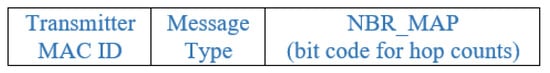 As soon as the network starts functioning in tactical communication, each SDR sends NBR_DSCV packet to all its one-hop neighbor(s) in its slot. The format of NBR_DSCV packet is shown in Figure 2, where transmitter ID is the MAC ID of sending node, i.e., for a network of N nodes, bits are required for the node’s MAC ID. The four-bit message type field identifies message format, i.e., NBR_DSCV, REQ, REQ_ACK, BRDSCT, combined_REQ or combined_ACK. The bits value 0000 indicates the NBR_DSCV packet, and NBR_MAP field gives hop count information of each neighbor, i.e., two-bit code for each node representing possible combinations, with 01, 10, and 11 defining 1, 2, and 3-hop, respectively. The bit code 00 represents that the node is not in a 1-hop or 2-hop neighborhood; usually, it represents itself.