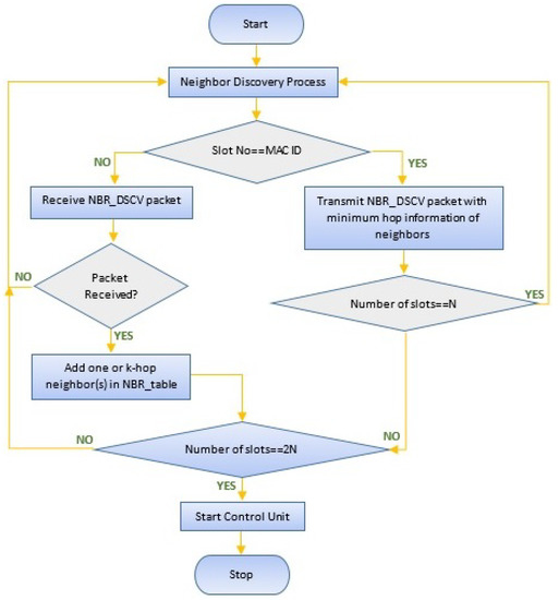 The process of neighbor discovery and the built-up NBR_table are described in Figure 3 it repeats for the next N slots, and radios that cannot get information in the first receive it in this round.