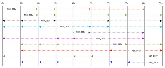 Flow diagram of one-time neighbor discovery process for N nodes, where N = {1, 2, 3, ... , 10}.