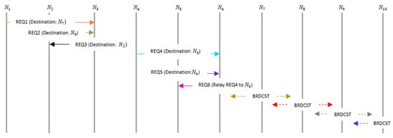 In the third time slot, has data for and, at the same time, has two more transmissions to relay in its queue (3→7 and 3→1). In this condition, sends a combined_REQ message with destinations and next-hops, as shown in Figure 11. This reduces the number of control packets; otherwise, every time, SDR consumes one slot for each REQ message.