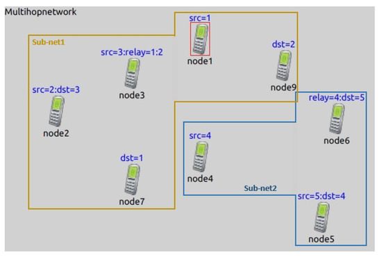 The proposed protocol allows SDRs of the tactical network to be confined into multiple virtual sub-nets. These sub-nets are formed autonomously using entries of TRANS_table, which is similar at every radio; thus, it results in the same sub-nets structure and number. The transmission pattern of nodes shapes sub-nets’ structures and has a maximum diameter equal to the network’s total number of nodes. Each SDR looks its TRANS_table up and forms virtual sub-nets based on the following rules: