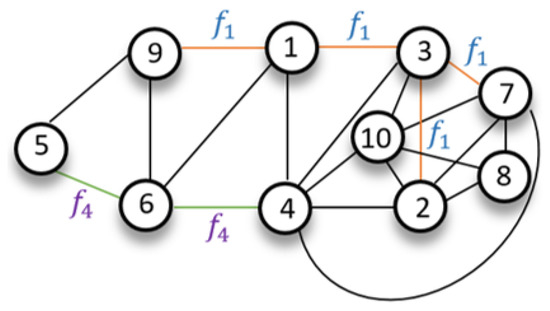 In the case of either rule, SDR belongs to the same sub-net and selects the data channel accordingly. After sub-nets formation, the proposed design uses the FDMA technique that assigns different frequencies to different nodes. The selection of frequency for data transmission is adhesive with the pattern of sub-nets formation. Each node selects a frequency autonomously from a frequency band of range 0 to and matches with the lowest ID of the sub-net members. There is no collision in frequency selection among sub-nets because each sub-net has a different lowest node ID, e.g., in Figure 5, sub-net 1 has node4, sub-net 2 has node2, and sub-net 3 has node1 as the lowest member ID of the sub-nets; therefore, use frequency , and for data transmission, respectively. The control packets use one frequency from the same range, which is common and time-slotted.
