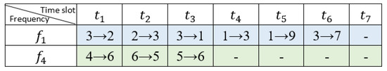 In the next time slot, sends the REQ message to for that is at 3-hop away. has confirmed 2-hop path information (2→3, 3→1) in its NBR_table but does not know whether is directly connected to or not. Therefore, it only adds a 2-hop path in its TRANS_table and sends the REQ message to . All the neighbors of update their TRANS_table as shown in Table 5. receives the REQ, knows the path to reach at , and adds 1→9 in its TRANS_table later shares it with its neighbors in the next control slot. The other neighbors add the same information as as they do not have the transmission route in their NBR_table.