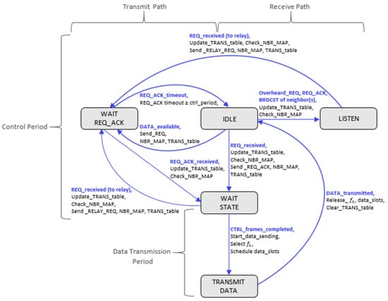 The proposed design can send combined REQ and REQ_ACK packets, or nodes can have multiple requests from different transmitters [29]. This reduces the number of control packets and puts a marginal effect on control overhead, call setup delays, and network convergence. Furthermore, in SDRs communication, not all radios have messages all the time; therefore, if a node does not have any REQ or REQ_ACK message to send, it sends a broadcast (BRDCST) message in its time slot. The BRDCST packet contains NBR_MAP and TRANS_table to maintain similar neighbor and transmission information on every node when not received from REQ or REQ_ACK packets.