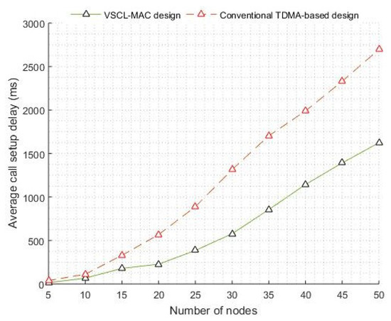 Average call setup delay for VSCL-MAC and TDMA-based MAC design.