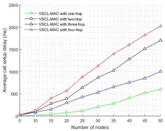 We evaluated the call setup time of network topologies when all nodes transmit on the same hop and analyzed the average call setup delay of VSCL-MAC, as shown in Figure 19. For 1-hop transmissions, a total of 2.5 or 3 control frames are consumed. The design is simulated for maximum 4-hop transmission, which merely has 2200 ms on average of call setup delay with a network of 50 nodes and consumes only five control frames.
