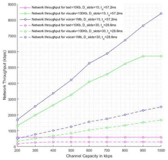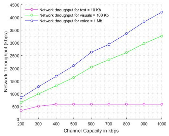 In consideration of above settings, the slot size of 28.6 ms is not enough to send 1250 bytes (10 Kb) of data over of 200 kbps and 300 kbps. However, with of 400 kbps to 1000 kbps, each TX node of sub-nets can transmit all 10 Kb of text message, keeping the data slot size unchanged, as shown in Figure 20. For visuals and voice messages, increases with , as more data bits can be transmitted. It is also due to the allocation of two and three data slots to each TX for respective message types and has a diverse impact on channel utilization and network throughput.