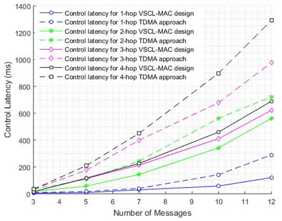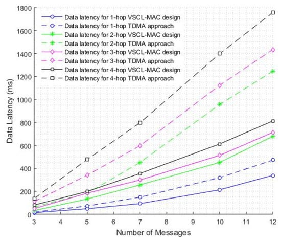 The quantitative comparison for control and data latency is performed between proposed VSCL-MAC and conventional TDMA design for the different number of messages M. We considered multiple hops to evaluate the latency for both packet types, i.e., control and data. The proposed scheme has low latency values for every hop network compared with TDMA, as shown in Figure 22. In the proposed design, with an increase in the number of hops k, the number of control frames L also increases with the count of one, e.g., , whereas in conventional TDMA design, L is large, as each transmission consumes an individual slot for every transmission. The increase in latency lowers the maximum throughput for the channel and makes it intelligible that the network performance lessens with an increase in the number of nodes.