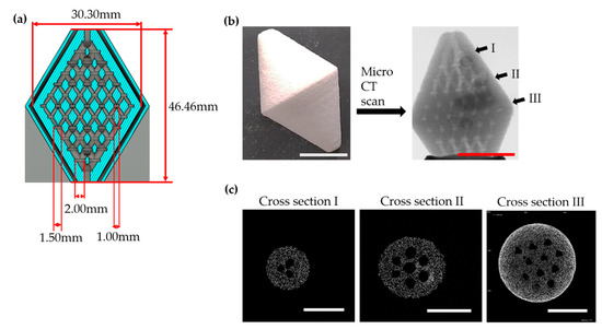 The three-dimensional scaffold was printed by translating the CAD model as depicted in Figure 2a using the SLS printer. The truncated shape of the macroporous scaffold with interconnected branches in multilayers was to accommodate larger volume of scaffold in 3-D space, which can be physiologically significant. Therefore, the macroporous scaffold design had an inlet and outlet with interconnected branches for the uniform distribution of the culture medium. Toward the center of the macroporous scaffold, from one of the openings, the diameter of the interconnected channel was subdivided into three layers of 2 mm, 1.5 mm, and 1 mm, designated as region I, II, and III, respectively, in Figure 1b. Furthermore, the detailed diameter was screened using micro-CT scanning of cross sections of region I, II, and III in Figure 2c.