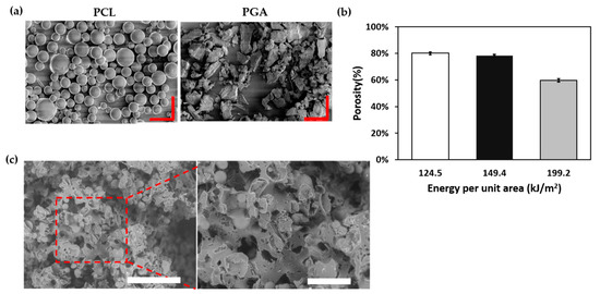 (a) Morphology of the PCL and PGA microparticle under scanning electron microscopy (SEM) (scale bar 100 µm, magnification 500×); (b) the % of porosity of the 3-D construct versus energy density. Each column represents mean ± SD with n = 3 independent experiments; (c) morphology of the macroporous scaffold after leaching out of PGA microparticle under SEM, showing the porous network (scale bar 500 µm, magnification 100× and 200 µm, magnification 200×).