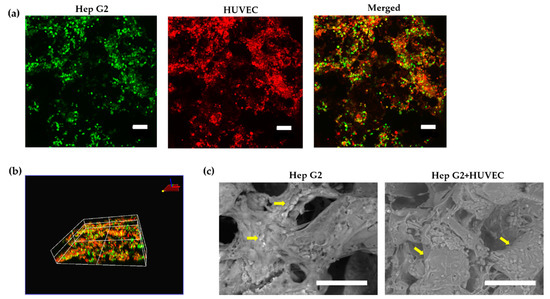 (a) Live imaging of Hep G2 and human umbilical vein endothelial cells (HUVEC) after 10 days of perfusion culture (scale bars 100 µm, magnification 4×); (b) volume z-stacked view of the Hep G2 and HUVEC cultured on the scaffold; (c) SEM images of Hep G2-covered scaffold and co-culture of Hep G2 and HUVEC at day 10. The yellow arrows show the morphology of Hep G2 and HUVEC grown on the scaffold (scale bar 100 µm, magnification 200×).