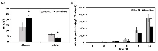 (a) Glucose consumption and lactate production of pure culture Hep G2 and co-culture Hep G2/HUVEC under perfusion culture system at day 10; (b) albumin production between Hep G2 and co-culture Hep G2/HUVECs showed significant different with p < 0.05 indicated by * at day 10. Each column represents the mean ± SD (n = 3 independent experiments), * p < 0.05.