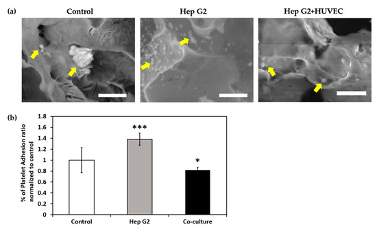 Hemocompatibility assessment: (a) SEM images of scaffold deposited with platelets on the control (no cell), Hep G2-covered scaffold, and co-culture (Hep G2 +HUVEC) scaffold. Platelet deposition and aggregation are shown by yellow arrows (scale bar is 20 µm, magnification 1000×); (b) The % of platelet adhesion ratio (% of PAR) of the Hep G2-covered scaffold and co-cultured scaffold normalized to the control. Each column represents mean ± SD with n = 3 independent experiments, * p < 0.05, *** p < 0.005 versus control.