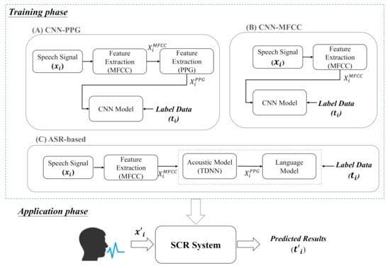 Three well-known speech command recognition (SCR) systems: (A) convolution neural network with Mel-frequency cepstral coefficient (CNN–MFCC), (B) convolution neural network with a phonetic posteriorgram (CNN–PPG) and (C) automatic speech recognition (ASR)-based.