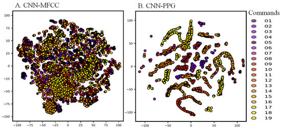 The t-SNE analysis of (A) CNN–MFCC model and (B) CNN–PPG model. In the CNN–PPG groups, the t-SNE of 19 commands were separate, distinct from the CNN–MFCC groups. Note: the labels “01” to “19” are the commands of close, up, down, previous, next, in, out, left, right, home, one, two, three, four, five, six seven, eight, and nine, respectively.