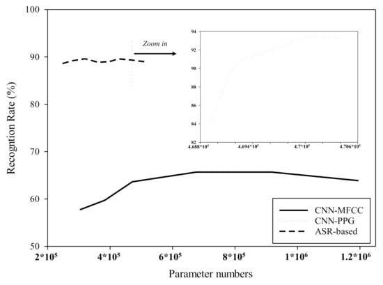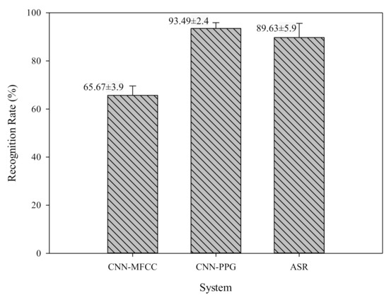The number of parameters of the system used is related to the implementation costs, such as computation consumption and memory size; meanwhile, a large model size (i.e., higher parameter numbers) causes longer response time and has battery lifetime issues [69,70]. Therefore, under a similar recognition performance condition, a smaller model size could provide more benefits for users. The experimental results show that the CNN–PPG can provide a higher recognition rate than the other two SCR systems with a lower model size than the ASR-based system. Hence, these results suggest that the CNN–PPG system can provide practical feasibility in the future.