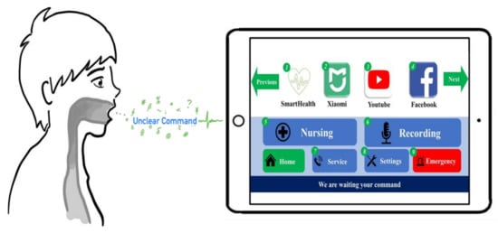 Dysarthric speaking is often associated with aging as well as with medical conditions, such as cerebral palsy (CP) and amyotrophic lateral sclerosis (ALS) [1]. It is a motor speech disorder caused by muscle weakness or lack of control and often makes someone’s speech unclear; hence, patients cannot communicate well with people (or machines). Currently, augmentative and alternative communication (AAC) systems are used to improve patient communication capabilities, such as communication boards [2], head tracking [3], gesture controlling [4], and eye-tracking [5] technologies. Previous studies have shown that these systems provided benefits to help patients communicate with people; however, there is still room for improvement. For example, communication using these devices is often slow and unnatural for dysarthric patients [6]; hence, it affects the communication performance of dysarthric patients directly. To overcome these issues, many studies [7] have proposed speech command recognition (SCR) systems that can help patients control devices via their voice, such as automatic speech recognition (ASR) systems [8] and acoustic pattern recognition technologies [9].