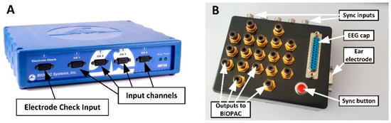 BIOPAC acquisition unit (A) and developed EEG headbox (B).