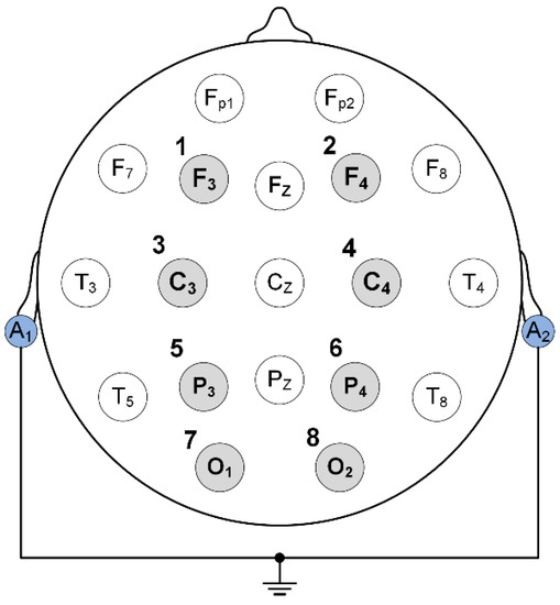 The headbox acted as a convenient interconnection between the acquisition units and the EEG electrode cap. We built a headbox (Figure 2B) for up to five BIOPAC acquisition units and a regular EEG cap with 19 electrodes terminated by a 25-pin connector. Each channel was connected to the BIOPAC unit via a shielded cable that was terminated by a cinch connector and a nine-pin connector on the headbox side and the acquisition unit’s side, respectively. In accordance with the international 10–20 scheme, channels (cinch connectors) on the headbox were situated with 19 EEG electrodes. The synchronization button was located on the headbox and enabled all the linked units to start the acquisition at simultaneously. The structure of the 8-channeled EEG system is shown in Figure 3, and the electrode localization is shown in Figure 4. The unipolar EEG measurement configuration was used while the neutral electrode was formed by connected and grounded ears (Figure 4). The sampling rate of the data acquisition was 1 kHz.