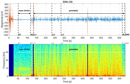The spectrogram of the C4 channel of subject 1 is shown at the bottom of Figure 5. This type of spectrogram represents the most examined subjects (10 from 21 subjects). Alpha activity in the frequency range from 8–12 Hz is clearly visible while eyes are closed (between E1 and E2 flags), and the signal spectrum is diffused to the whole brain frequency sub-bands during the gameplay (between L1 and END flags). These two features are typical for this group of subjects. In Figure 5, the alpha activity at a frequency around 10 Hz is clearly seen as a yellow horizontal stripe in the segment of closed eyes. There is an interval of attenuated brain activities at the end of the gameplay. This interval stands for walking to the game exit after the last logical problem is successfully solved, and no more active thinking is necessary. The R flag marks this moment. The artifacts are marked by red in the time domain and blue rectangles in the frequency domain.
