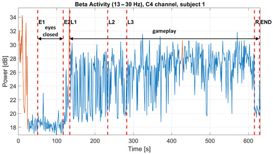 The power of brain activity can be computed with the help of PSD estimation, e.g., by the Welch method using Equations (1), (2), and (4). The same parameters used to calculate the spectrogram can be used for this (i.e., Hamming window with a length of two seconds (N = 2000 samples) and one-second window overlap). If the power of specific brain activity (e.g., beta activity) is desirable; then, the signal is filtered by the band-pass filter to extract specific brain activity from the EEG signal before PSD computation. Thanks to the already computed spectrogram, the PSD can be computed in another, and in this case, a simpler manner. The spectrogram shows the power of the signal (PSD) in [dB] per each time segment (one-second resolution on the x-axis in Figure 5) according to Equation (7). The power of the signal is coded into spectrogram colors. Then, the PSD of beta activity at a selected time interval can be taken from the spectrogram in the frequency interval from 13–30 Hz. The average power of beta activity in a specified time interval is then the mean of the values in this frequency band. The progress of average beta activity in time is plotted in the graph shown in Figure 6. The movement artifacts are marked by orange color.