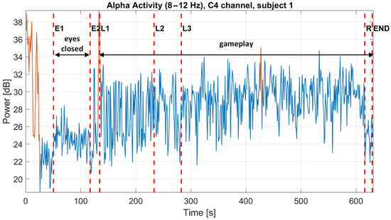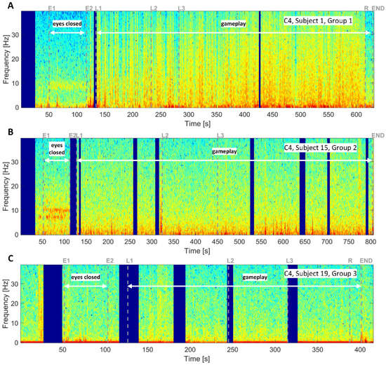 The EEG signals were processed in the MATLAB programming language. The movement artifacts were manually identified in the EEG record with the help of a synchronized video record. Ref. [67] The short periods of movement artifacts are denoted in the EEG, and these periods are excluded from spectral EEG analysis. The spectrogram of the EEG signal was computed by using Equations (5) and (7). The length of the window is set to two seconds (N = 2000 samples), windows are overlapped by one second (R = 1000), and the cosine Hamming function was used as a windowing function w[n]. The beta activity was dominant in the frontal and central regions; on the other hand, the alpha activity was dominant in the brain’s posterior regions. To analyze the subject’s brain activity during the gameplay, we used the C4 electrode in the central region as a compromise. Moreover, the C4 electrode was chosen via prior knowledge about all electrodes’ electric impedances during the measurement’s setup. This electrode featured the lowest electric impedance (<5 kΩ) among all electrodes and all subjects. By analyzing all measured subjects, we found out that the results are very individual across the subjects. Beta activity is responsible for active thinking and the stage of high alert. On the other hand, the alpha activity was typical of a relaxed state, increased with closed eyes. Therefore, we focused on analyzing the beta and the alpha activity during relaxation with closed eyes and gameplay. We can divide subjects into three generalized groups based on the type of spectrogram. All three types are discussed further in the following subsections.