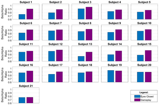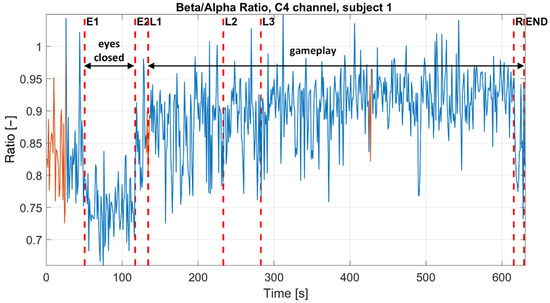 The beta/alpha ratio characterizes the relation between alpha and beta waves. The beta/alpha ratio increases when the brain is activated and decreases during brain inactivation. Therefore, this ratio is a significant parameter in evaluating brain response to some specific mental activity [68,69]. The development of the beta/alpha ratio during the experiment is shown in Figure 8. According to the graph, it is evident that the brain is more activated during the gameplay.