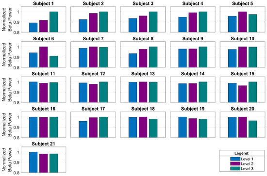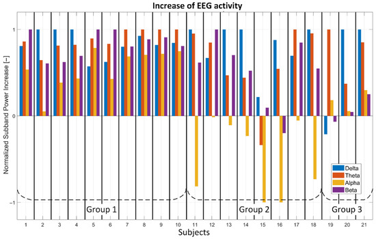 To demonstrate the classification’s correctness, we calculated the increase of brain activity in the delta, theta, alpha, and beta sub-band using Equations (10)–(13) for all examined subjects. The results are depicted in Figure 13. The power of sub-band brain activities is normalized by maximum value within the subject. The absolute values in Figure 13 cannot be compared across individuals because slightly different skin–electrode impedance will raise different signal strength and power. On the other hand, we are able to evaluate the increase or decrease of particular activity during the gameplay across subjects and the mutual ratio of brain activities within the subject. If the value of power is negative, then the brain activity decreased during the gameplay. During the gameplay, increased brain activity in all frequency bands is typical for subjects in group 1. A decrease of alpha activity is typical for group 2, and a negligible increase of beta activity compared to alpha activity is typical for group 3. As we can see from the bar plots, the delta and theta waves were significantly raised during the gameplay [70].