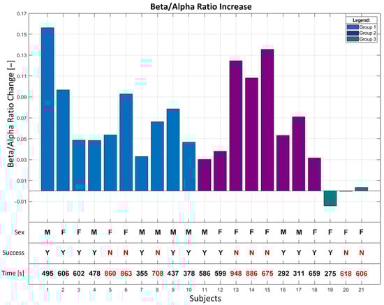 The graph of the increase of beta/alpha ratios for all subjects is shown in Figure 14. The negative or low values mean a decrease in the beta/alpha ratio, which is typical for group 3. The graph also includes the sex of subjects, game playtime, and the indicator if the game was successfully finished or not. The average time to successful game finish was 467 s (7 min and 47 s). The decrease of the beta/alpha ratio in subject 19 does not mean decreased attenuation (beta activity) during the gameplay. However, it reflects the highest increase of relaxation (alpha) activity compared to the beta activity across all subjects (see Figure 13). The one possible reason is that subject 19 likes to solve logical puzzles, which she argued after the game was over. This fact is supported by the shortest time of the game walkthrough. It is seen that seven of 12 women and one of nine men could not finish the game’s last level, which is the most difficult. Subjects 20 and 21 were very stressed before the gameplay, which they confirmed after the experiment. They could not relax and focus on the game, so the beta/alpha ratio is decreasing.