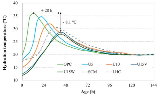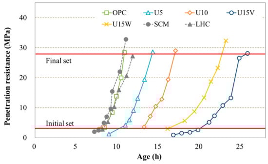 Figure 2 shows the results of setting tests conducted according to ASTM C191 [32] in which the penetration resistance of concrete was measured 30–60 min after placing. The main focus of the assessment of the initial and final setting points of cement is the retardation performance of elements. Because the elements show a sharp decrease in temperature owing to the reaction with water, cement composites with a low temperature at early placing require a greatly increased setting time. The experimental results indicate that in contrast to the slope of the curve, which is similar in almost all mixtures until the final setting time is reached after the initial setting, the starting point of the curve, that is, the initial setting point, differs greatly for different mixtures. For the U15V mixture with considerable urea and the U15W mixture, the initial setting point was retarded by up to more than 12 h and 8 h, respectively, relative to that of OPC. This phenomenon is attributed to the fact that the top surface is left in a wet state for a long time owing to the increased amount of initial bleeding as the amount in an unhardened state increases; furthermore, the concrete placing temperature decreases sharply immediately after mixing [33]. The SCM and LHC mixtures showed similar tendencies to the standard OPC mixture, indicating that the initial reaction of low-heat cementitious materials does not have a significant effect on the setting properties.