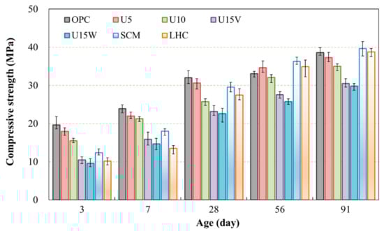 The compressive strength measurements of three specimens were averaged for each low-heat mixture including the urea mixture ratio (Figure 3). Concrete with relatively low hydration heat is known to show slow strength development, and therefore, the compressive strength was measured for up to 91 days. Relative to the OPC mixture, the mixture with urea shows ~60% strength with initial aging for three and seven days. This tendency becomes more distinctive as the urea mixture proportion is increased gradually. As in SCM or LHC, the hydration temperature is controlled by adjusting the reaction velocity (or reacting dose) of cement hydration or inducing the pozzolanic reaction. On the contrary, because mixing urea in concrete results in a temperature decrease as soon as it dissolves in water, it is considered to affect the speed of strength development through cement hardening and retardation. With long-term aging for more than 56 days, LHC containing urea showed a strength close to that of the standard OPC mixture. This result is attributed to the continuous reaction of cement particles over time that are not hydrated sufficiently in the early stage, and it can be considered a typical strength property of a low-heat mixture. However, U15V and U15W mixtures showed ~78% strength development with long-term aging for 91 days compared to the standard OPC mixture. Considering the required safety factor for a given site, separate measures must be taken to enhance the concrete strength; a urea mixture proportion of within 10% is considered appropriate.