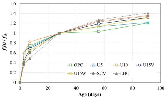 Figure 4 shows the typical compressive strength gain ratio measured in the experiment. The compressive strength (fc(t)) of a specimen with an aging of t days was normalized on the basis of the compressive strength (fcu) at 28 days to examine the strength development with early aging (<28 days) and long-term aging (>28 days). The strength gain ratio at 3 days relative to the 28-day strength of a mixture with urea was between 0.42 (U15W) and 0.60 (U5), and that at 91 days was between 1.21 (U5) and 1.36 (U15V). The long-term strength gain ratio of all mixtures exceeded the conventional value of 1.05–1.2 for plain concrete as presented in ACI 318 [29], thus enabling the evaluation of strength development in low-heat mixtures.