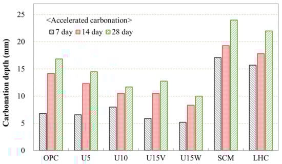 Figure 5 shows the results of the experiments performed to assess the resistance to CO2 penetrating concrete from the air. The experimental results indicated that an increasing urea mixture proportion resulted in higher resistance to CO2 penetration. This result is mainly attributed to the strong alkalinity; in contrast to the pH of a general cement composite, which is known to be 12–13, it reduces to ~9 by carbonation [30]. As shown in Table 1, the pH of urea is ~12.8. Therefore, concrete is more likely to maintain its alkalinity with an increase in the urea mixture proportion, and this may increase the resistance of the structures to carbonation. On the other hand, SCM and LHC specimens showed much greater carbonation depths than other mixture ratios. The SCM and LHC mixtures have a high proportion of SiO2 in the binders because a mineral admixture is used, and they both consume Ca(OH)2 in cement through a hydration process [23]. Ca(OH)2 is a key element that maintains the alkalinity of concrete, and an alternative mineral admixture for avoiding the deterioration of the carbonation durability of concrete has not been found thus far. Mixing urea in concrete could solve the carbonation durability problem.