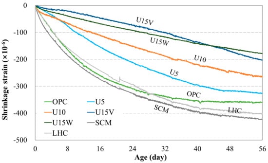 Existing low-heat mixtures such as SCM and LHC show a strain similar to that of OPC. In general, the early hydration of LHC is slow, and the strength development takes a long time to end [7]. Therefore, it is more likely to cause dry shrinkage because the remaining water quantity is relatively high without contributing to hydration during early placing [12,31]. This is one of the reasons why it is difficult to control both dry shrinkage and hydration heat simultaneously. However, high durability is required in dams or marine structures, and concrete mixed with urea could be a promising alternative for these applications.