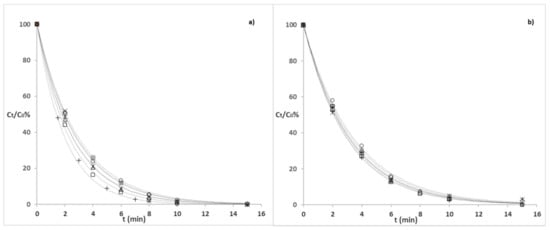 The degradation profiles of the investigated GCs (50 µg L−1) in tap (a) and river (b) water samples under simulated solar light are shown in Figure 1.