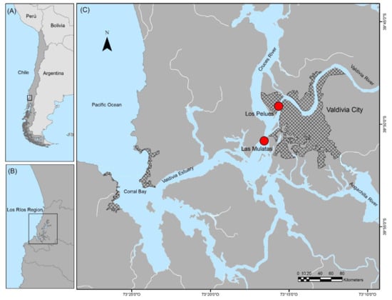 The Valdivia River estuary is located in the Los Ríos Region of Chile (39°48′ S, 73°14’ W) (Figure 1). The area has a humid temperate climate with an average annual precipitation of 1600 mm and an average annual temperature is 12.9 °C. Most rainfall occurs between May, June, and July. The surface water level in the estuary fluctuates seasonally, increasing in the winter months because discharges are mostly caused by rain. The Valdivia River estuary has a semi-diurnal tidal regimen with ±1.48 m of mean tidal range and is classified as “positive microbial” [13] and tidal movement takes place 20 km inland of the river´s mouth. The Valdivia River estuary has a mean width of 700 m and a maximum depth of 18 m close to Valdivia city [8], which has a population approximately of 143,000 people. Two sampling sites were established within the estuary to evaluate water quality and fish samples, Site 1—Los Pelues, adjacent to the city area (39°50’ S–73°16’ W) and Site 2—Las Mulatas, downstream of the sewage treatment plant (39°48’ S–73°15’ W) (Figure 1).