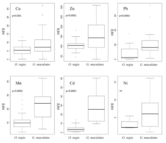The average concentrations of Cu recorded in the tissue samples were 5.4 µg/g (0.17–13.3 µg/g) in O. regia, and 10.4 µg/g (0.11–32.08 µg/g) in G. maculatus (Figure 2). Zn average concentrations were 104.7 µg/g (45.14–181.5 µg/g) in O. regia, and 155.2 µg/g (35.08–308.54 µg/g) in G. maculatus (Figure 2). Pb average concentrations were 8.5 µg/g (0.18-35.04 µg/g) in O. regia, and 22.7 µg/g (1.33–73.96 µg/g) in G. maculatus (Figure 2). Mn average concentrations were 10.8 µg/g (3.24–30.58 µg/g) in O. regia, and 22.9 µg/g (5.49–42.34 µg/g) in G. maculatus (Figure 2). Cd average concentrations were 4.1 µg/g (0.47–13.98 µg/g) in O. regia, and 28.4 µg/g (9.76–60.24 µg/g) in G. maculatus (Figure 2). Ni average concentrations were 3.3 µg/g (2.09–5.47 µg/g) in O. regia, and 6.4 µg/g (0.91–16.17 µg/g) in G. maculatus (Figure 2).