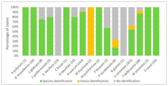 Percentage of clones given identical identification by 26S rDNA sequencing and MALDI-TOF MS (the number of clones considered is given in brackets).