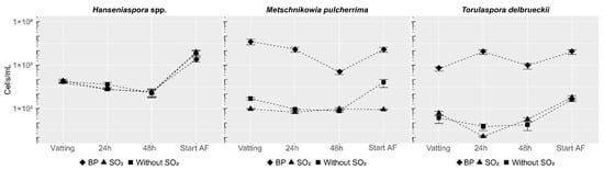 Population dynamics of Hanseniaspora spp., Metschnikowia pulcherrima, and Torulaspora delbrueckii. During prefermentary stages (vatting, 24 h, and 48 h of maceration, start of alcoholic fermentation). Bioprotection (BP), SO2, and without SO2 treatments. Values indicated as the mean of four technical replicates ± standard deviation.