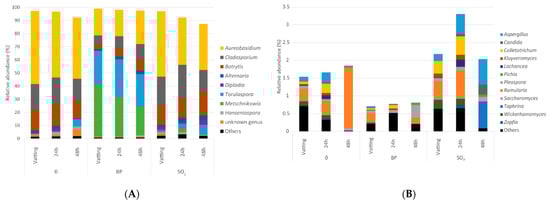 (A) Relative genus abundances based on the taxonomic assignation of high-quality 18S rDNA reads of Ascomycota phylum from must samples at prefermentary stages (treatment: without SO2 (0), SO2 (SO2), bioprotection (BP); stages: vatting, 24 h prefermentary maceration, 48 h prefermentary maceration). (B) Relative genus abundances in “Others” category for each sample. (Mean of biological replicates).